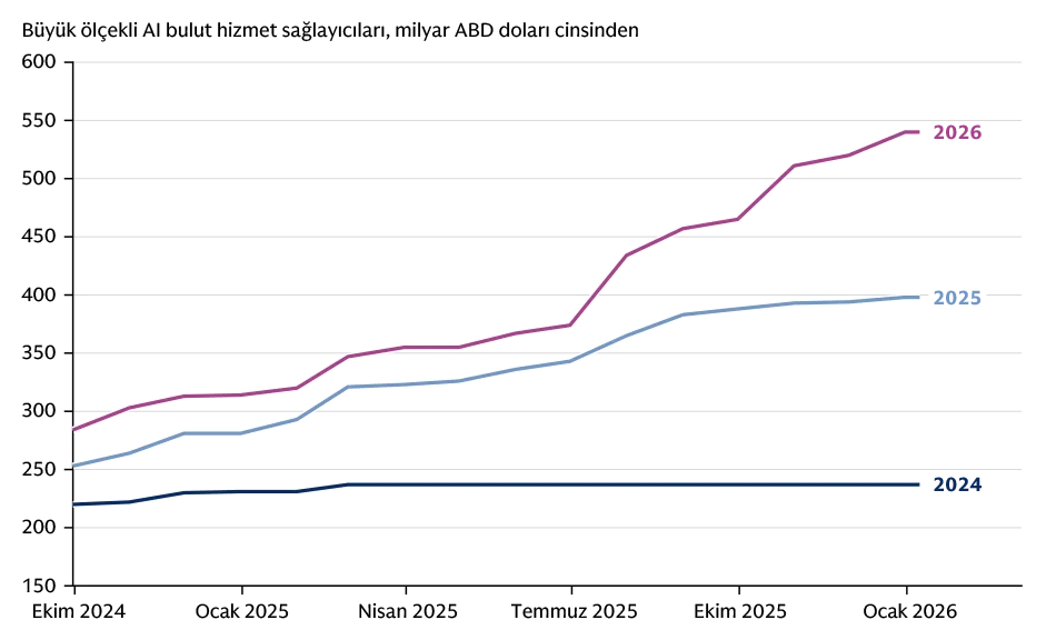 Yapay zeka, finans piyasalarına yön veren ve genel anlamda ekonomiye de yön verebilecek olan önemli bir unsur olarak ortaya çıktı. Yapay zekaya yapılacak yatırım tahminleri sürekli geride kalan Wall Street analistleri, 2026’da en büyük hiper ölçekli bulut bilişim şirketlerinin sermaye harcamalarına yarım trilyon dolardan fazla para akıtmasını bekliyor. Goldman Sachs Research’e göre en büyük yedi teknoloji şirketi şu anda S&P 500’ün piyasa kapitalizasyonunun %30’undan fazlasına ve endeksin kazançlarının dörtte birine karşılık geliyor.