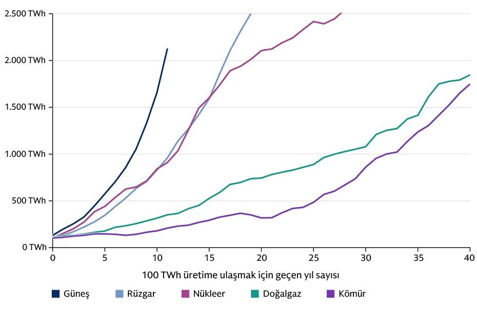 Goldman Sachs Research küresel emtia araştırmaları eş başkanı Daan Struyven, "Diğer enerji kaynaklarıyla karşılaştırıldığında, güneş enerjisi üretimindeki artış, elektrik tarihinin en hızlısı" diyor. Güneş enerjisi, yaygınlaşmaya başladıktan sonraki 11 yıl içinde 2.129 Terawatt/saat (TWh) seviyesine ulaşarak, Temmuz 2025'e kadar olan 12 aylık dönemde küresel enerji üretiminin %8'ini karşıladı.